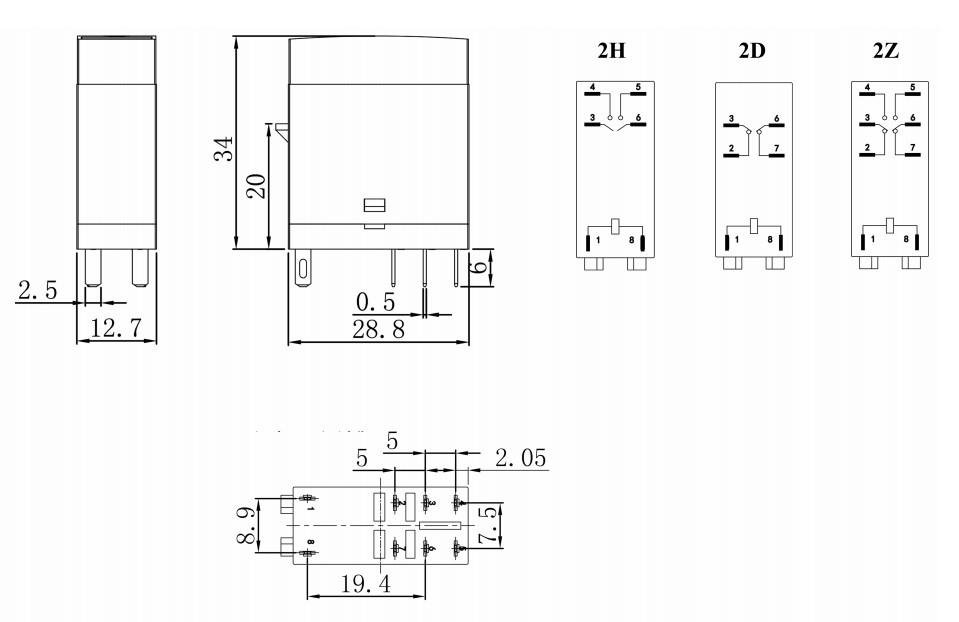 Funzione di contatto | Modulo | 1Z (SPDT); 1H (SPST-NO); 1D (SPST-NC) | 2Z (dpdt); 2H (dpst-no); 2D (dpst-nc) | |||||